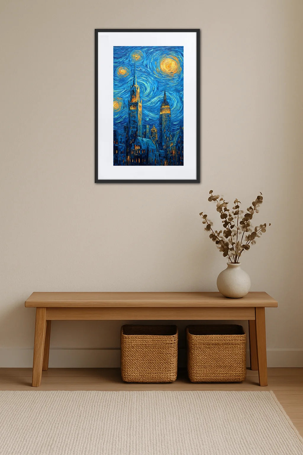 Inspiré par l’intensité vibrante de New York et la touche tourbillonnante de Van Gogh, ce tableau transcende la simple image pour devenir une expérience sensorielle. Le ciel nocturne, animé de spirales lumineuses, évoque une nuit étoilée où la ville ne dort jamais. Les gratte-ciel emblématiques se dressent avec force et élégance, leurs lumières dorées se mêlant au bleu profond du ciel, comme pour rappeler que la vie urbaine est une œuvre d’art en constante évolution. Cette rencontre entre l’expressionnisme vibrant et l’iconographie new-yorkaise célèbre la fusion entre tradition et modernité, entre rêve et réalité. Chaque coup de pinceau semble capter le souffle de la ville, son rythme effervescent, mais aussi ses instants suspendus, où la lumière et l’ombre dialoguent intensément. Le tableau devient alors un hommage à la créativité, à l’ambition et à la beauté cachée dans chaque recoin de la métropole, une invitation à contempler et ressentir l’énergie singulière d’un lieu unique.
