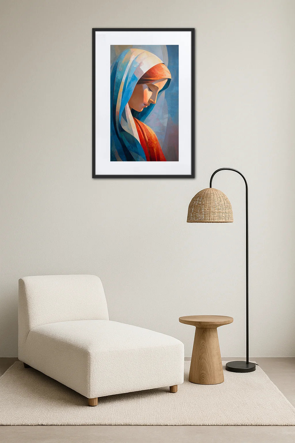 Cette œuvre contemporaine revisite la figure emblématique de la Vierge avec une modernité délicate et pleine de sens. Le visage incliné, empreint de sérénité, évoque un moment suspendu entre douceur et force intérieure. La composition joue sur des contrastes subtils entre lumière et ombre, tandis que les formes géométriques apportent une dimension abstraite et actuelle. Ici, la tradition iconographique est transcendée par une palette riche, où chaque couleur dialogue avec l’autre pour créer une atmosphère enveloppante. Au-delà de la représentation religieuse, ce tableau invite à une méditation sur la féminité, la protection et le mystère. Il incarne une poésie visuelle qui transcende le temps, mêlant histoire et sensibilité contemporaine. La Vierge moderne devient le symbole d'une introspection profonde, d’une élégance sobre qui résonne avec l’observateur, invitant à un voyage intérieur où la lumière se fait guide. Ce jeu de formes et de teintes, maîtrisé avec finesse, donne vie à une icône revisitée, qui parle à la fois au cœur et à l’esprit.