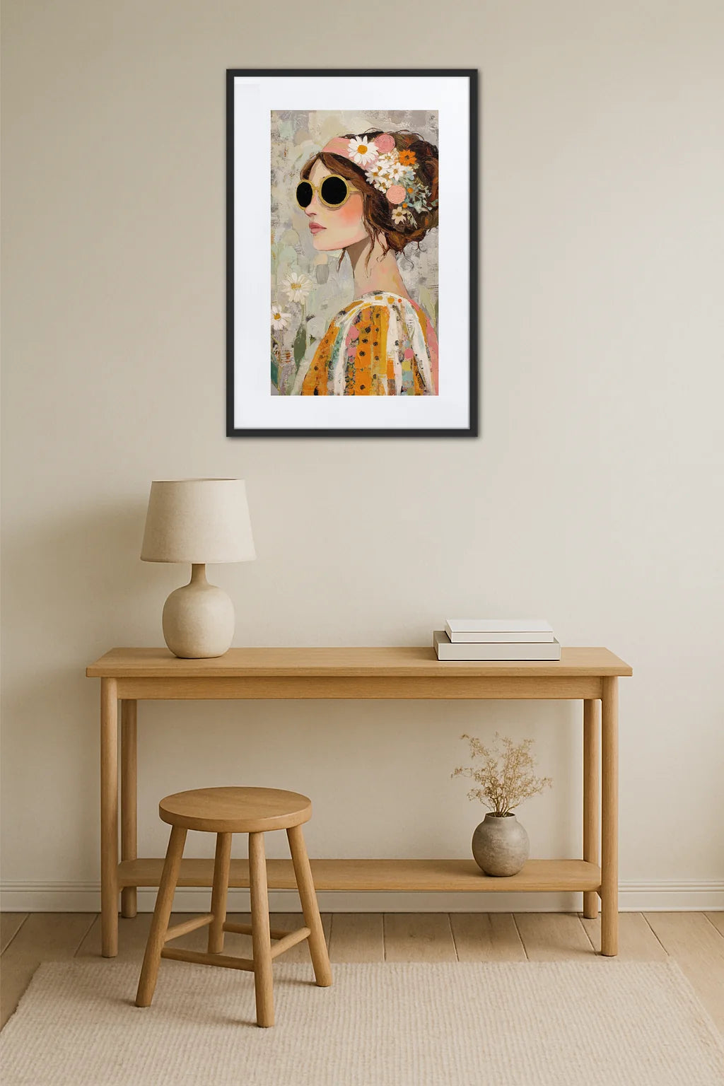 Ce tableau est une ode à la féminité enveloppée dans une atmosphère florale où chaque détail raconte une histoire. La silhouette féminine, tournée de profil, se pare de lunettes rondes qui brouillent le regard, symbolisant une invitation à observer au-delà des apparences. La coiffure ornée de fleurs, mêlant marguerites et petites roses, semble capter la lumière d’un jour d’été, évoquant la douceur d’un instant suspendu. Les teintes chaleureuses et les touches de texture apportent une profondeur qui résonne comme un poème visuel. L’artiste détourne ici l’iconographie classique du portrait, mêlant la délicatesse des fleurs à la force du regard masqué, créant un contraste visuel saisissant. Ce tableau s’inscrit dans une tradition contemporaine qui valorise le mélange des genres, l’expression d’une personnalité à la fois fragile et assurée. Il évoque aussi cette rencontre entre la nature et l’identité, comme une métaphore de l’épanouissement personnel. Plus qu’une simple représentation, il offre une expérience émotionnelle où chaque nuance invite à la contemplation et à l’émerveillement.