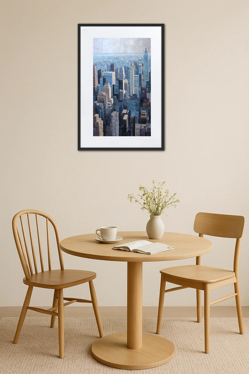 Cette œuvre incarne l’énergie singulière d’une ville iconique, où chaque immeuble raconte une histoire d’ambition et d’espoir. Dans un jeu subtil de formes et de volumes, les silhouettes des gratte-ciels se dressent telles des sentinelles d’un rêve collectif, tandis que l’horizon lointain semble promettre un avenir d’infinies possibilités. La lumière douce qui baigne la scène confère une atmosphère presque méditative, contrastant avec la densité urbaine et la frénésie qui caractérisent New York. Ce tableau ne se contente pas de reproduire un paysage, il révèle une émotion profonde, un souffle vital qui anime la cité. Il suggère le ballet incessant des vies humaines qui s’entrelacent, la poésie des instants suspendus entre béton et ciel. Plus qu’une simple représentation, cette vue panoramique invite à ressentir la grandeur d’une mégapole où la culture, le progrès et le rêve s’entremêlent dans une harmonie fragile et précieuse.