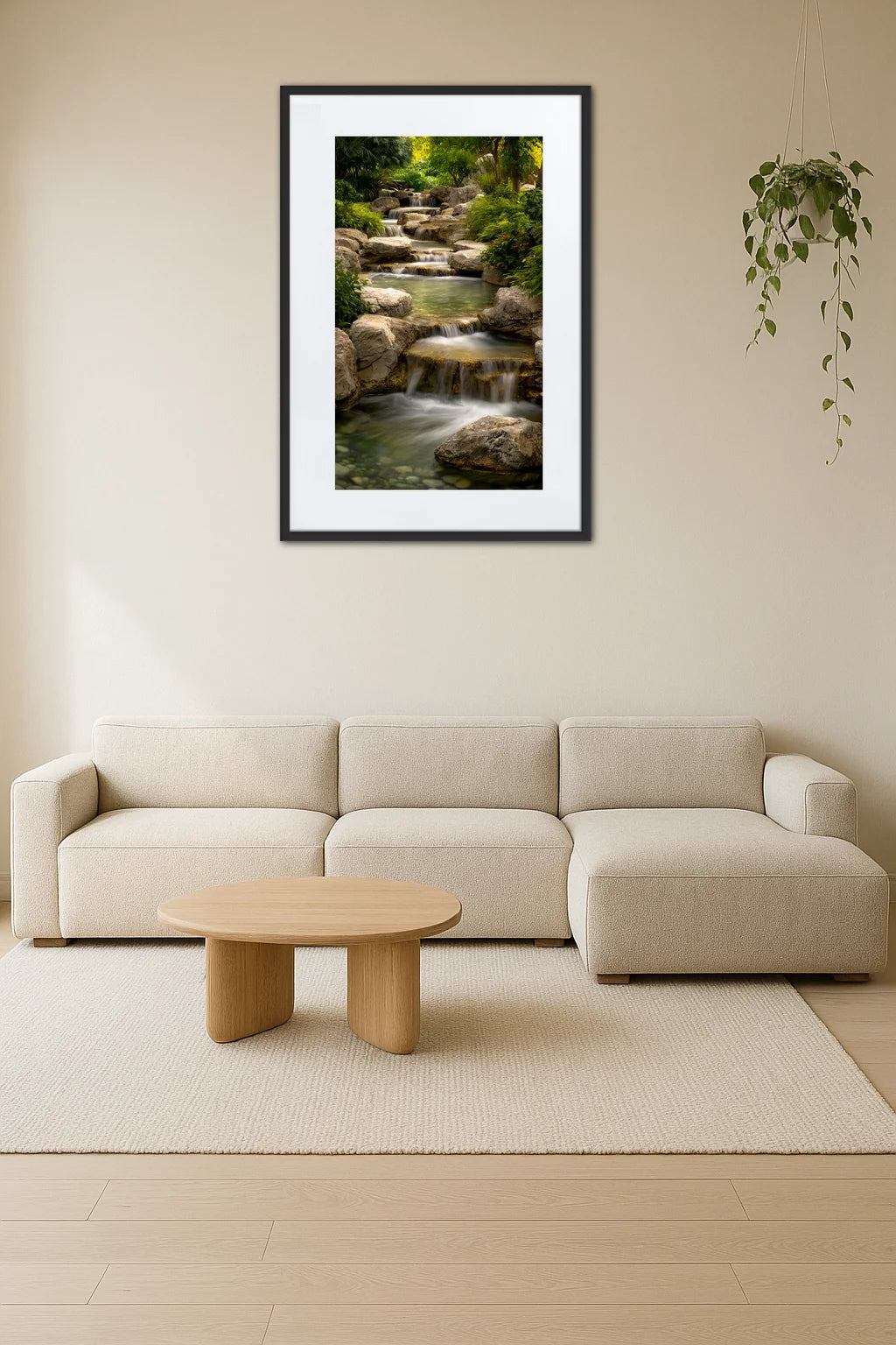 Ce tableau est une ode à la nature dans son expression la plus pure et harmonieuse. Il capture l’essence d’un jardin secret où l’eau s’écoule avec grâce sur des rochers polis, dessinant un chemin lumineux parmi la végétation luxuriante. L’œuvre évoque un équilibre fragile entre mouvement et quiétude, entre lumière dorée et ombres profondes. Ce jeu subtil rappelle les principes d’une esthétique zen, où chaque élément trouve sa juste place pour apaiser l’esprit et éveiller les sens. Au-delà de sa simple représentation, ce tableau incarne la promesse d’un voyage intérieur, celui d’une immersion dans un refuge où la nature dialogue avec l’âme. Il parle aussi d’une culture ancienne, inspirée des jardins japonais, où la simplicité se fait sophistication, où la contemplation devient art. En intégrant ce tableau chez soi, on invite une présence bienveillante et inspirante, porteuse d’une énergie bienfaisante qui transcende l’ordinaire.